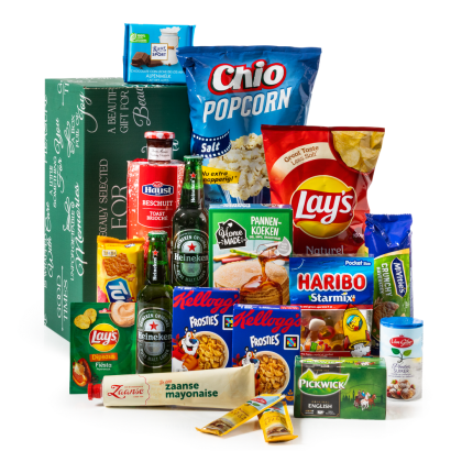 Inhoud Dit pakket bevat de volgende 21 artikelen: Puzzelboek voor volwassenen, 3 ass Jupiler, 25 cl, 2 st Schulp appelsap, 75 cl Ribbelchips zout, 90 gram Toast, 100 gram Kaaspuntjes, 125 gram Nibbz pinda’s gezouten, 50 gram XXL pretzelsticks, 200 gram Grissini broodstengels, 125 gram Tomatensoep, 450 ml Chocomelk, 500 ml Zwarte thee, 20 zakjes Pally speculoos koekjes, 250 gram Sneeuwballen, 60 gram Chocolade boomhangers, 100 gram Koekreep, 90 gram Karamelsticks, 50 gram Popcorn zoet, 100 gram Mallow trees, 140 gram Verpakt in een feestelijke geschenkdoos, 390 x 290 x 232 mm