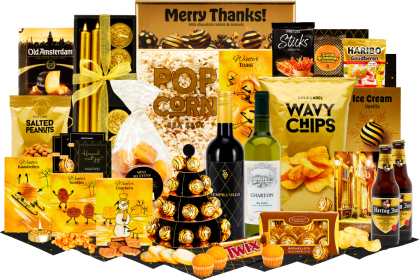 Inhoud Dit pakket bevat de volgende 51 artikelen: Elektrische deken, 80 Watt, 160 x 130 cm Geschenkdoos met strik, 21 x 8,5 x 4 cm Dinerkaarsen, 20 cm, 2 st Waxines, 4 st Kaartspel "Weet jij het?" Servetten, 8 st Rode wijn, Tempranillo, 0,75 ltr Witte wijn, Montmeyrac, 0,75 ltr Bier, Hertog Jan, 0,30 ltr, 2 st Schulp appelsap, 0,2 ltr Richello's chocolade, 100 gr, 8 st Fuet worst, 150 gram Pasteitjes kerstklok, 100 gram Hartige zoutjes peper-zeezout, 60 gram Kaaswafelbolletjes, 50 gram Krokante toast, 75 gram Pretzels, 40 gram Koekreep, 110 gram Popcorn, 70 gram Pinda's gezouten, 50 gram Ribbelchips gezouten, 90 gram Stroopwafel, 64 gram, 2 st Haribo goudbeertjes, 75 gram Mini muffins, 200 gram Stokbrood in bakvorm, 200 gram Thee selectie 3 smaken, 3 st Appeltaartmix in bakvorm, 300 gram IJsmix vanille, 125 gram Chocoreep pinda, 225 gram Ragout kip, 290 gram Chips Lay's sensations thai sweet chilli, 40 gram Vegter's rolletjes, 10 st Old amsterdam wigstuk, 150 gram Kerstkoekjes, 80 gram Sweet box inhoud: Geschenkdoos Sweetbox, 16 x 23 x 2,5 cm Boterwafels De la Digue, 10 gram, 3 st Kanjers mini stroopwafels, 8 gram De Ruiter speculoos koekjes, 25 gram Haribo goudbeertjes zakje, 10 gram Lonka nougat caramel, 12 gram Tiny tony chocolonely puur, mini Toblerone, mini* Verpakt in een feestelijke geschenkdoos, 59 x 39 x 20 cm