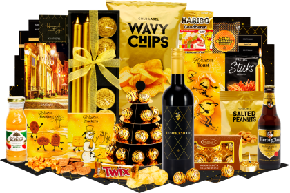 Inhoud Dit pakket bevat de volgende 29 artikelen: Kaartspel "Weet jij het?" Rode wijn, Tempranillo, 0,75 ltr Geschenkdoos met strik, 21 x 8,5 x 4 cm Dinerkaarsen, 20 cm, 2 st Waxines, 4 st Servetten, 8 st Bier, Amstel, 0,33 ltr, 2 st Hartige zoutjes peper-zeezout, 60 gram Pretzels, 40 gram Kruidcake in a cup, 280 gram Koekreep, 110 gram Chocolade hazelnoot pralines, 110 gram Popcorn, 70 gram Pinda's gezouten, 50 gram Stroopwafel, 64 gram, 2 st Kitkat, 41,5 gram Haribo happy cola, 75 gram Pringles original, 40 gram Lay's chips naturel, 100 gram Doritos bits twisties honey BBQ, 30 gram Maltesers, 37 gram Kerstkoekjes, 80 gram Verpakt in een feestelijke geschenkdoos, 39 x 29 x 12,6 cm