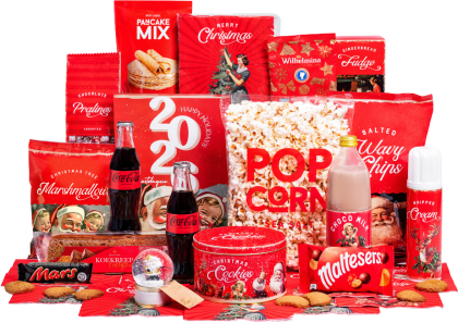 Inhoud Dit pakket bevat de volgende 13 artikelen: Coca cola regular fles, 0,2 ltr Zwarte thee, 5 st Pretzels, 40 gram Pinda's gezouten, 50 gram Stroopwafel, 64 gram, 2 st Kitkat, 41,5 gram Haribo happy cola, 75 gram Pringles original, 40 gram Chips Lay's sensations thai sweet chilli, 40 gram Doritos bits twisties honey BBQ, 30 gram Kerstkoekjes, 80 gram Verpakt in een feestelijke geschenkdoos, 31 x 20 x 14 cm