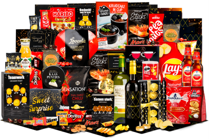 Inhoud Dit pakket bevat de volgende 50 artikelen: Snijplank acaciahout, 34 x 20,5 cm Geschenkdoos met strik, 21 x 8,5 x 4 cm Dinerkaarsen, 20 cm, 2 st Waxines, 4 st Kaartspel "Weet jij het?" Wensbal Rode wijn, Tempranillo, 0,75 ltr Bier, Amstel, 0,33 ltr, 2 st Schulp appelsap, 0,2 ltr Zwarte thee, 5 st Hartige zoutjes peper-zeezout, 60 gram Krokante toast, 75 gram Pretzels, 40 gram, 2 st Kruidcake in a cup, 280 gram Popcorn, 70 gram Pinda's gezouten, 50 gram Stroopwafel, 64 gram, 4 st Napoleon aardbeikogels, 80 gram Mars mini, 18 gram, 2 st Kitkat, 41,5 gram Haribo happy cola, 75 gram Pringles original, 40 gram Lay's chips naturel, 100 gram Smoeltjes, 25 gram Kaaspuntjes, 125 gram Chips Lay's sensations thai sweet chilli, 40 gram Doritos bits twisties honey BBQ, 30 gram, 2 st Bruschetta tomato & mozzarella, 70 gram Kerstkoekjes, 80 gram Sweet box inhoud: Geschenkdoos Sweetbox, 16 x 23 x 2,5 cm Boterwafels De la Digue, 10 gram, 3 st Kanjers mini stroopwafels, 8 gram De Ruiter speculoos koekjes, 25 gram Haribo goudbeertjes zakje, 10 gram Lonka nougat caramel, 12 gram Tiny tony chocolonely puur, mini Toblerone, mini* Verpakt in een feestelijke geschenkdoos, 39 x 29 x 17,5 cm