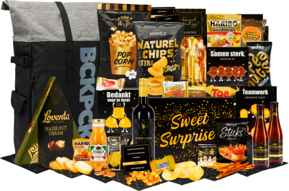 Inhoud Dit pakket bevat de volgende 29 artikelen: Solar lantaarn lamp, 27 x 14 cm Kaartspel "Weet jij het?" Servetten, 8 st Sparkling grape, (alcoholvrij), 750 ml Hartige zoutjes peper-zeezout, 60 gram Kaaswafelbolletjes, 50 gram Krokante toast, 75 gram Pretzels, 40 gram Zwarte thee, 5 st Cake bakmix, 350 gram Koekreep, 110 gram Pinda's gezouten, 50 gram Ribbelchips gezouten, 90 gram Chocolade hazelnoot pralines, 110 gram Haribo goudbeertjes, 75 gram Kaaspuntjes, 125 gram Twix, 50 gram Kerstkoekjes, 80 gram Sweet box inhoud: Geschenkdoos Sweetbox, 16 x 23 x 2,5 cm Boterwafels De la Digue, 10 gram, 3 st Kanjers mini stroopwafels, 8 gram De Ruiter speculoos koekjes, 25 gram Haribo goudbeertjes zakje, 10 gram Lonka nougat caramel, 12 gram Tiny tony chocolonely puur, mini Toblerone, mini* Verpakt in een feestelijke geschenkdoos, 39 x 29 x 17,5 cm