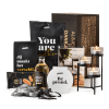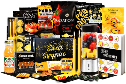 Inhoud Dit pakket bevat de volgende 8 artikelen: Theelichthouderset van zwart metaal, 11 x 11 x 18 cm Tien waxinelichtjes in zwart organza zakje Lemonade, 250 ml Compliment ribbelchips paprika, 90 gram Beautiful Nuts pinda, 50 gram Toast naturel, 75 gram Kaaspuntjes, 140 gram Verpakt in een feestelijke geschenkdoos, 310 x 200 x 140 mm