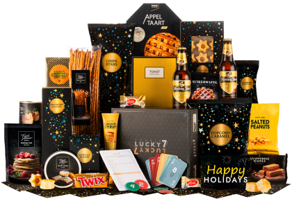 Inhoud Dit pakket bevat de volgende 67 artikelen: Geschenkdoos met strik, 21 x 8,5 x 4 cm Dinerkaarsen, 20 cm, 2 st Waxines, 4 st Servetten, 8 st Kaartspel "Weet jij het?" Wensbal Rode wijn, Tempranillo, 0,75 ltr Witte wijn, Montmeyrac, 0,75 ltr Bier, Amstel, 0,33 ltr, 2 st Fuet worst, 150 gram Pasteitjes kerstklok, 100 gram Hartige zoutjes peper-zeezout, 60 gram Krokante toast, 75 gram Pretzels, 40 gram, 2 st Zwarte thee, 5 st Schulp appelsap, 0,2 ltr Kruidcake in a cup, 280 gram Chocolade hazelnoot pralines, 110 gram Popcorn, 70 gram Pinda's gezouten, 50 gram, 2 st Stroopwafel, 64 gram, 4 st Napoleon aardbeikogels, 80 gram Mars mini, 18 gram, 2 st Kitkat, 41,5 gram, 2 st Haribo happy cola, 75 gram Pringles original, 40 gram, 2 st Coca cola regular fles, 0,2 ltr, 2 st Lay's chips naturel, 100 gram Smoeltjes, 25 gram Tomatensoep, 500 ml Ragout kip, 290 gram Kaaspuntjes, 125 gram Koektrommel, 150 gram Chips Lay's sensations thai sweet chilli, 40 gram Doritos bits twisties honey BBQ, 30 gram, 2 st Bruschetta tomato & mozzarella, 70 gram Red band dropfruit, 90 gram Old amsterdam wigstuk, 150 gram Maltesers, 37 gram, 2 st Kerstkoekjes, 80 gram Sweet box inhoud: Geschenkdoos Sweetbox, 16 x 23 x 2,5 cm Boterwafels De la Digue, 10 gram, 3 st Kanjers mini stroopwafels, 8 gram De Ruiter speculoos koekjes, 25 gram Haribo goudbeertjes zakje, 10 gram Lonka nougat caramel, 12 gram Tiny tony chocolonely puur, mini Toblerone, mini* Verpakt in een feestelijke geschenkdoos, 45 x 35 x 23 cm