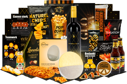Inhoud Dit pakket bevat de volgende 8 artikelen: Draagbare luidspreker/ speaker, 10 x 4,3 x 8 cm Vitaminedrink limoen-lychee, 500 ml Nibbz ribbelchips bolognese, 90 gram Winter pretzels, 100 gram Popcorn zoet, 120 gram Marshmallows vanille, 150 gram Meterdrop, 100 gram Verpakt in een feestelijke geschenkdoos, 390 x 290 x 126 mm