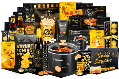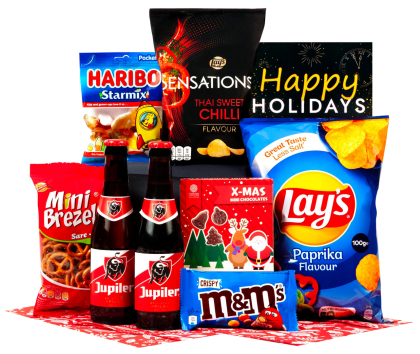 Inhoud Dit pakket bevat de volgende 34 artikelen: Airfryer, 1150 Watt, 2 ltr Geschenkdoos met strik, 21 x 8,5 x 4 cm Dinerkaarsen, 20 cm, 2 st Waxines, 4 st Kaartspel "Weet jij het?" Servetten, 8 st Rode wijn, Tempranillo, 0,75 ltr Bier, Hertog Jan, 0,30 ltr, 2 st Hartige zoutjes peper-zeezout, 60 gram Krokante toast, 75 gram Pretzels, 40 gram Pinda's gezouten, 50 gram Ribbelchips gezouten, 90 gram Chocolade hazelnoot pralines, 110 gram Stroopwafel, 64 gram, 2 st Kerstkoekjes, 80 gram Sweet box inhoud: Geschenkdoos Sweetbox, 16 x 23 x 2,5 cm Boterwafels De la Digue, 10 gram, 3 st Kanjers mini stroopwafels, 8 gram De Ruiter speculoos koekjes, 25 gram Haribo goudbeertjes zakje, 10 gram Lonka nougat caramel, 12 gram Tiny tony chocolonely puur, mini Toblerone, mini* Verpakt in een feestelijke geschenkdoos, 39 x 29 x 30 cm