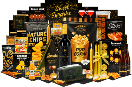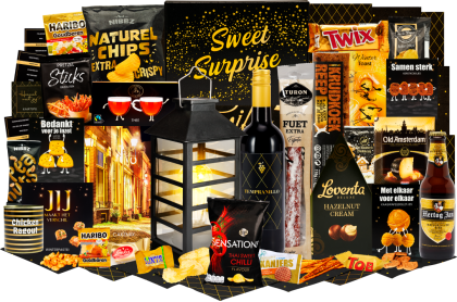 Inhoud Dit pakket bevat de volgende 44 artikelen: Elektrische deken, 80 Watt, 160 x 130 cm Geschenkdoos met strik, 21 x 8,5 x 4 cm Dinerkaarsen, 20 cm, 2 st Waxines, 4 st Kaartspel "Weet jij het?" Servetten, 8 st Rode wijn, Tempranillo, 0,75 ltr Bier, Hertog Jan, 0,30 ltr, 2 st Schulp appelsap, 0,2 ltr Fuet worst, 150 gram Hartige zoutjes peper-zeezout, 60 gram Kaaswafelbolletjes, 50 gram Krokante toast, 75 gram Pretzels, 40 gram Koekreep, 110 gram Popcorn, 70 gram Pinda's gezouten, 50 gram Ribbelchips gezouten, 90 gram Stroopwafel, 64 gram, 2 st Haribo goudbeertjes, 75 gram Thee selectie 3 smaken, 3 st Appeltaartmix in bakvorm, 300 gram IJsmix vanille, 125 gram Chocoreep pinda, 225 gram Chips Lay's sensations thai sweet chilli, 40 gram Old amsterdam wigstuk, 150 gram Kerstkoekjes, 80 gram Sweet box inhoud: Geschenkdoos Sweetbox, 16 x 23 x 2,5 cm Boterwafels De la Digue, 10 gram, 3 st Kanjers mini stroopwafels, 8 gram De Ruiter speculoos koekjes, 25 gram Haribo goudbeertjes zakje, 10 gram Lonka nougat caramel, 12 gram Tiny tony chocolonely puur, mini Toblerone, mini* Verpakt in een feestelijke geschenkdoos, 59 x 39 x 20 cm